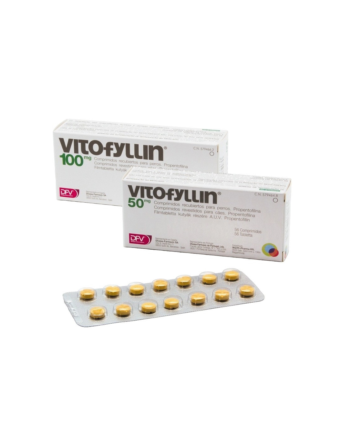 DFV Vitofyllin 100 mg del laboratorio DFV Laboratorios es un medicamento veterinario en comprimidos recubiertos específicamente desarrollado para mejorar la circulación vascular periférica y cerebral en perros. Su principio activo, la propentofilina, actúa como vasodilatador, ayudando a incrementar el flujo sanguíneo hacia tejidos clave como el cerebro y el corazón, lo que favorece una mejor oxigenación sin elevar la demanda de glucosa y contribuye al bienestar general del animal.
