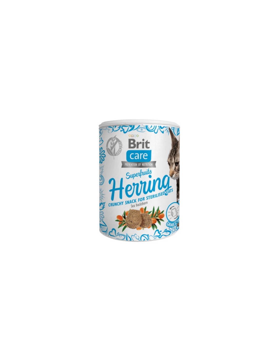 Los Brit Care Cat Snack Superfruits Herring Sterilized son unos snacks premium especialmente formulados para gatos esterilizados que combinan sabor irresistible con beneficios funcionales para su salud. Estos bocados están elaborados con arenque de alta calidad, una fuente natural de proteínas y ácidos grasos omega 3 que favorecen una piel sana y un pelaje brillante. La receta se enriquece con superfrutas como arándanos y coco, que aportan antioxidantes, vitaminas y minerales para reforzar las defensas naturales y contribuir al bienestar general de tu felino.