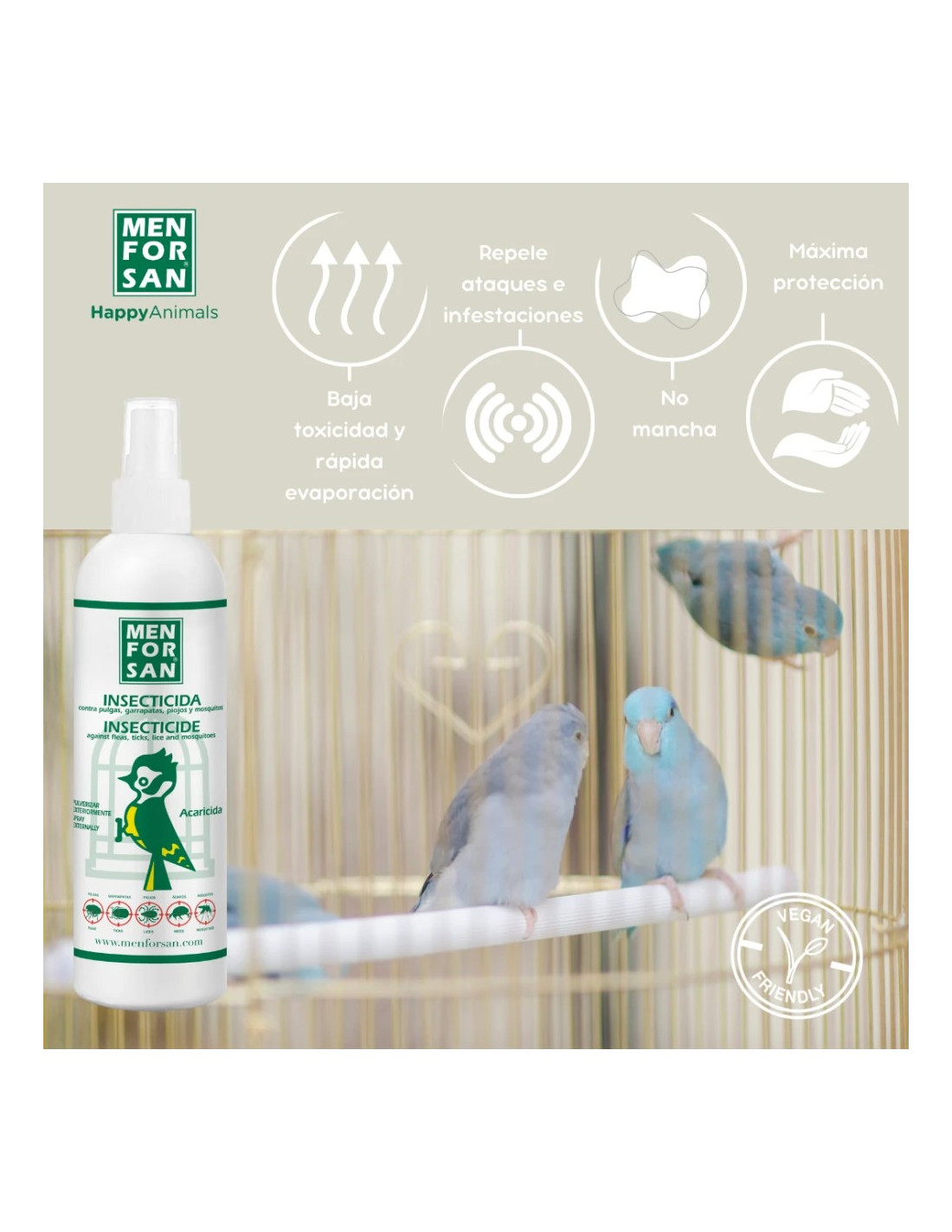 Protege a tus aves de manera eficaz frente a insectos y parásitos con el Insecticida de Menforsan. Especialmente formulado para jaulas, perchas y entornos de aves domésticas, elimina pulgas, piojillos, ácaros y otros insectos que pueden afectar la salud y el bienestar de tus mascotas.