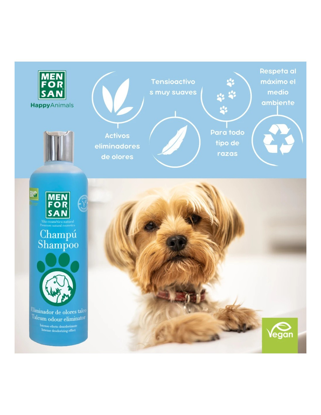 MENFORSAN Champú Eliminador de Olores Talco está formulado para eliminar eficazmente los malos olores del pelaje de perros, dejando una agradable y duradera fragancia a talco que aporta sensación de limpieza y frescura.