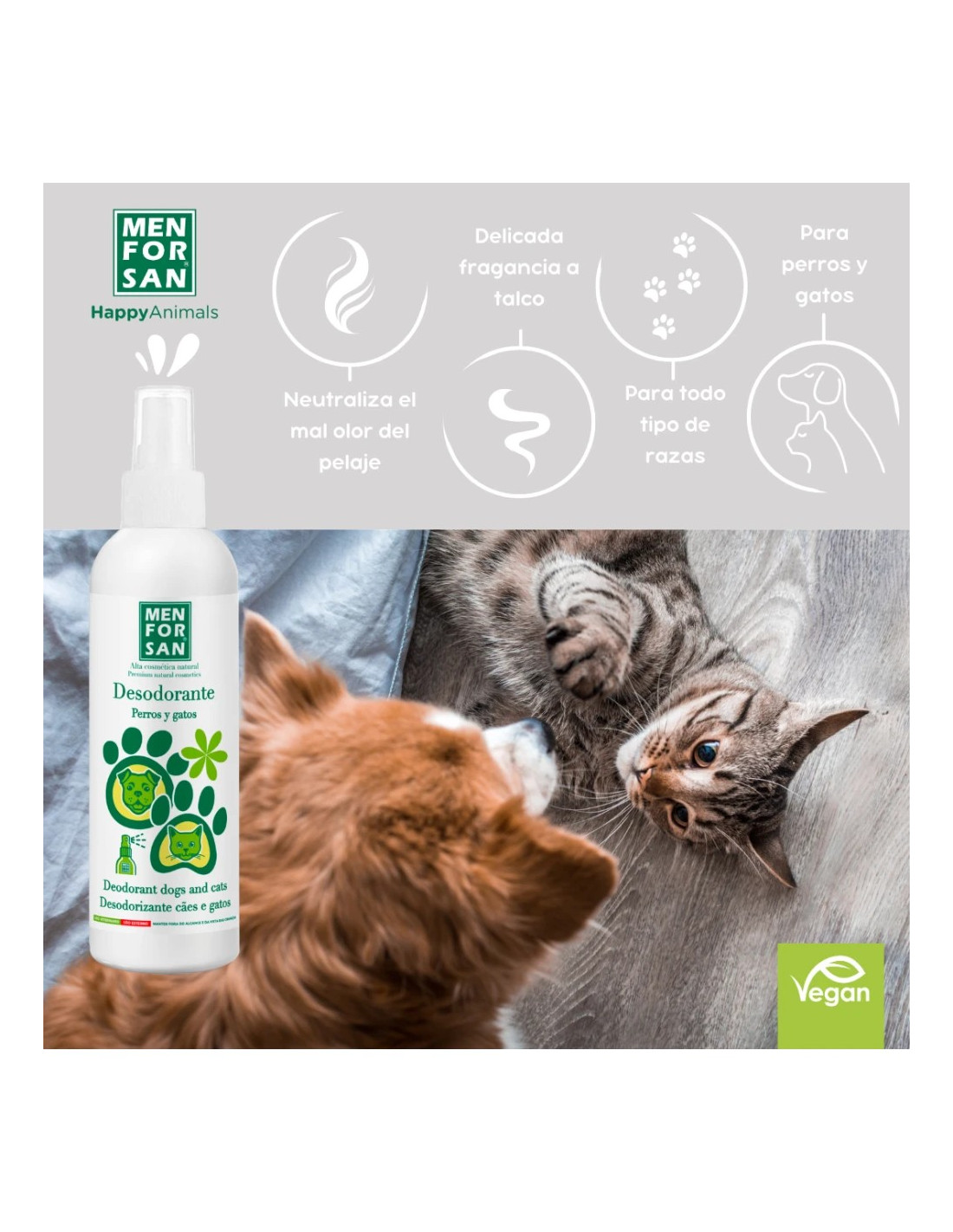 Gracias a su fórmula suave y equilibrada, este desodorante actúa neutralizando los olores en lugar de enmascararlos, dejando un perfume ligero y agradable que no resulta molesto para el sensible olfato de las mascotas. Su uso es seguro y puede aplicarse de forma habitual, siendo apto tanto para perros como para gatos de todas las razas y tipos de pelaje.