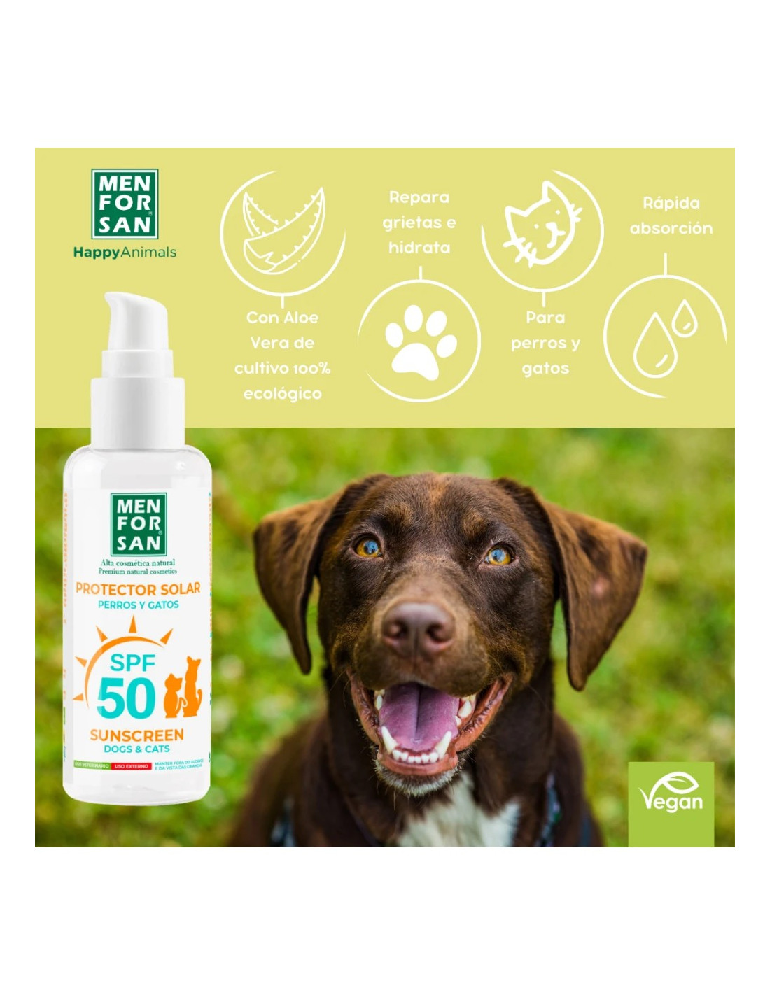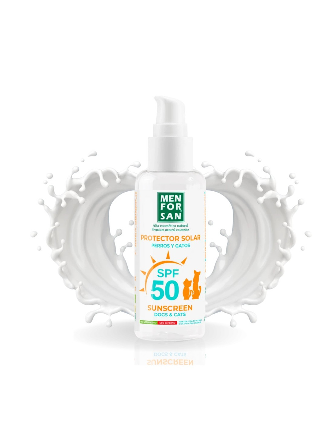 El Protector Solar Factor 50 para Perros y Gatos de Menforsan es un producto especialmente formulado para proteger la piel de tus mascotas de los efectos dañinos de los rayos solares, previniendo quemaduras, irritaciones y el envejecimiento prematuro de la piel. Su alta protección SPF 50 lo convierte en una solución eficaz para perros y gatos de todas las razas, edades y tipos de pelaje, especialmente aquellos con piel clara, zonas sin pelo o sensibles al sol.