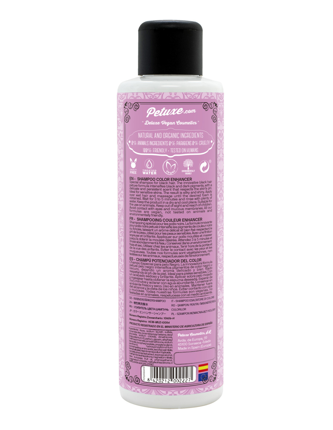 El Champú Potenciador de Color de Petuxe está especialmente formulado para realzar y mantener el manto oscuro y natural del pelaje de perros y gatos, aportando brillo, intensidad y un aspecto saludable desde el primer lavado. Su fórmula avanzada ayuda a resaltar la pigmentación del pelaje negro y de otros colores como el marrón sin alterar la estructura del pelo ni la piel.