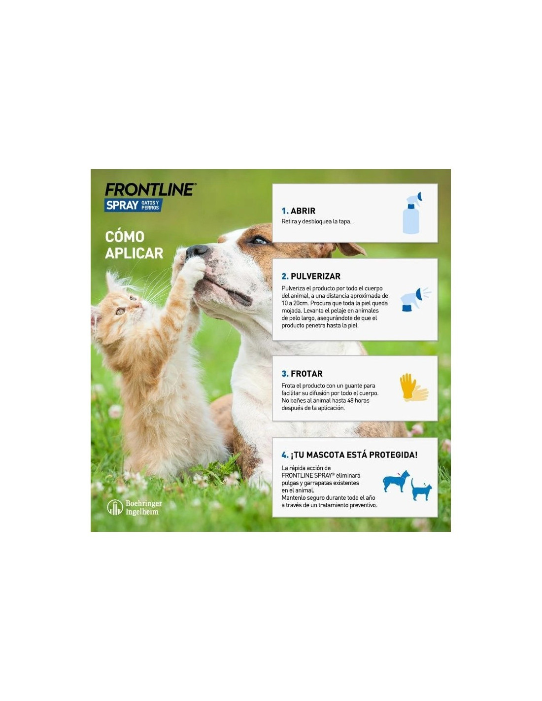 - Para la aplicación en la zona de la cabeza en animales nerviosos o jóvenes, se recomienda ponerse guantes, aplicar FRONTLINE SPRAY en ellos y luego frotar sobre la zona en cuestión.