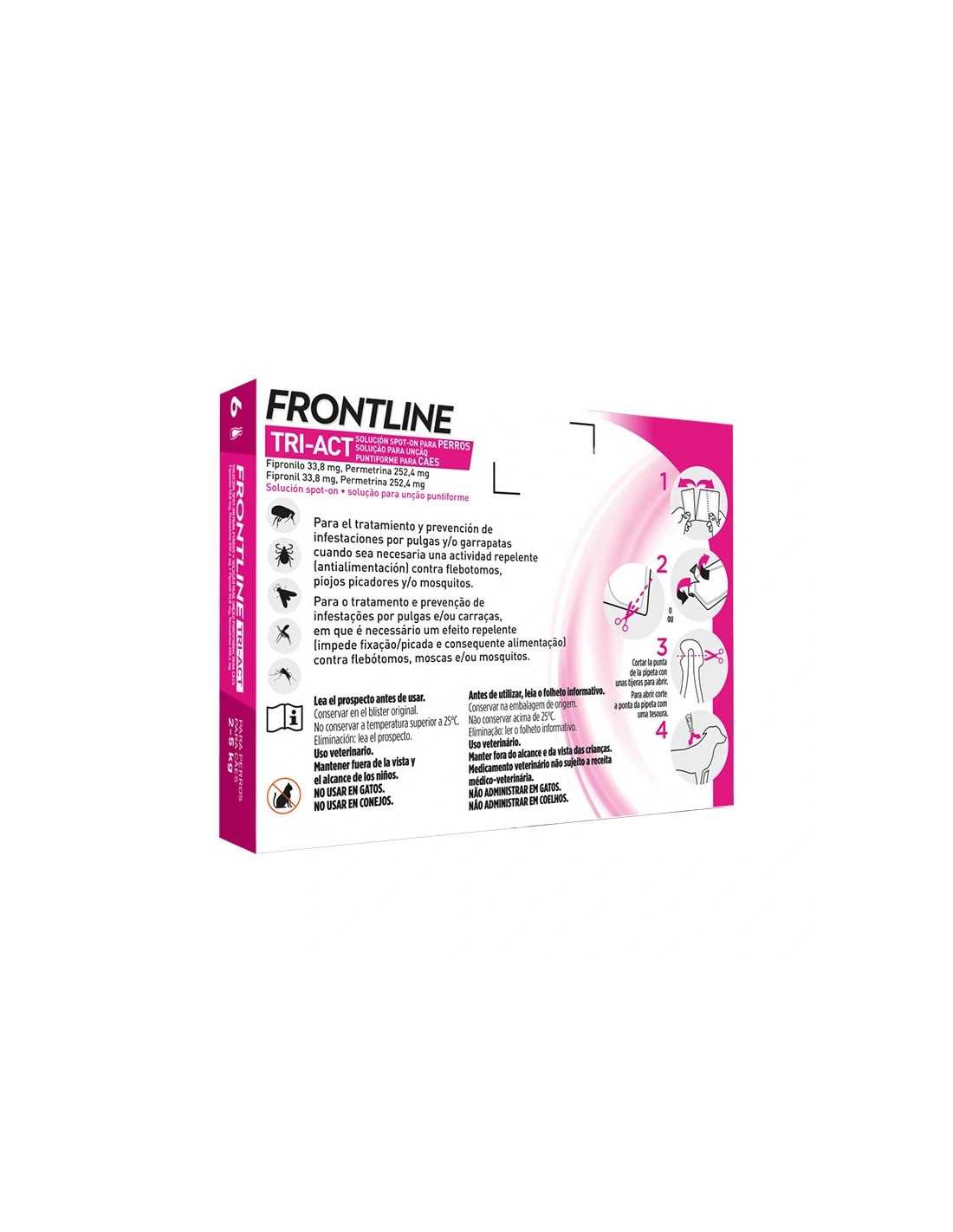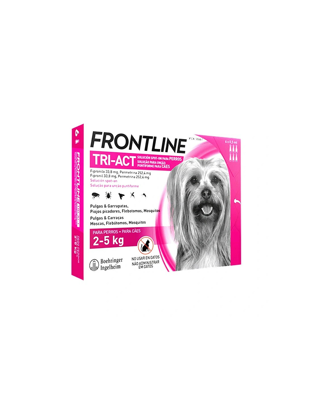 FRONTLINE® Tri-Act Pipeta para perros de 2 a 5 kg (6 x 0,5 ml) es un antiparasitario externo de amplio espectro, diseñado para proteger a tu perro frente a pulgas, garrapatas y piojos. Su innovadora fórmula de acción rápida actúa por contacto, eliminando los parásitos antes de que puedan picar y previniendo nuevas infestaciones.
