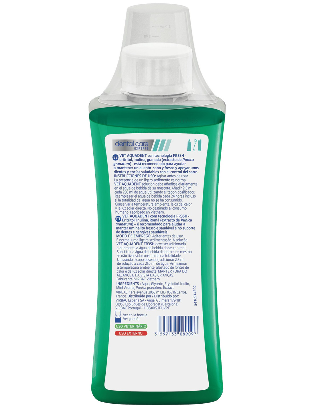 El Aquadent de Virbac es un complemento oral formulado para mejorar la higiene bucodental de perros y gatos de forma sencilla y diaria. Se trata de un aditivo para el agua de bebida que, al incorporarse a la rutina habitual, ayuda a reducir la placa bacteriana y el mal aliento, contribuyendo al mantenimiento de una boca más sana sin necesidad de cepillados complejos.