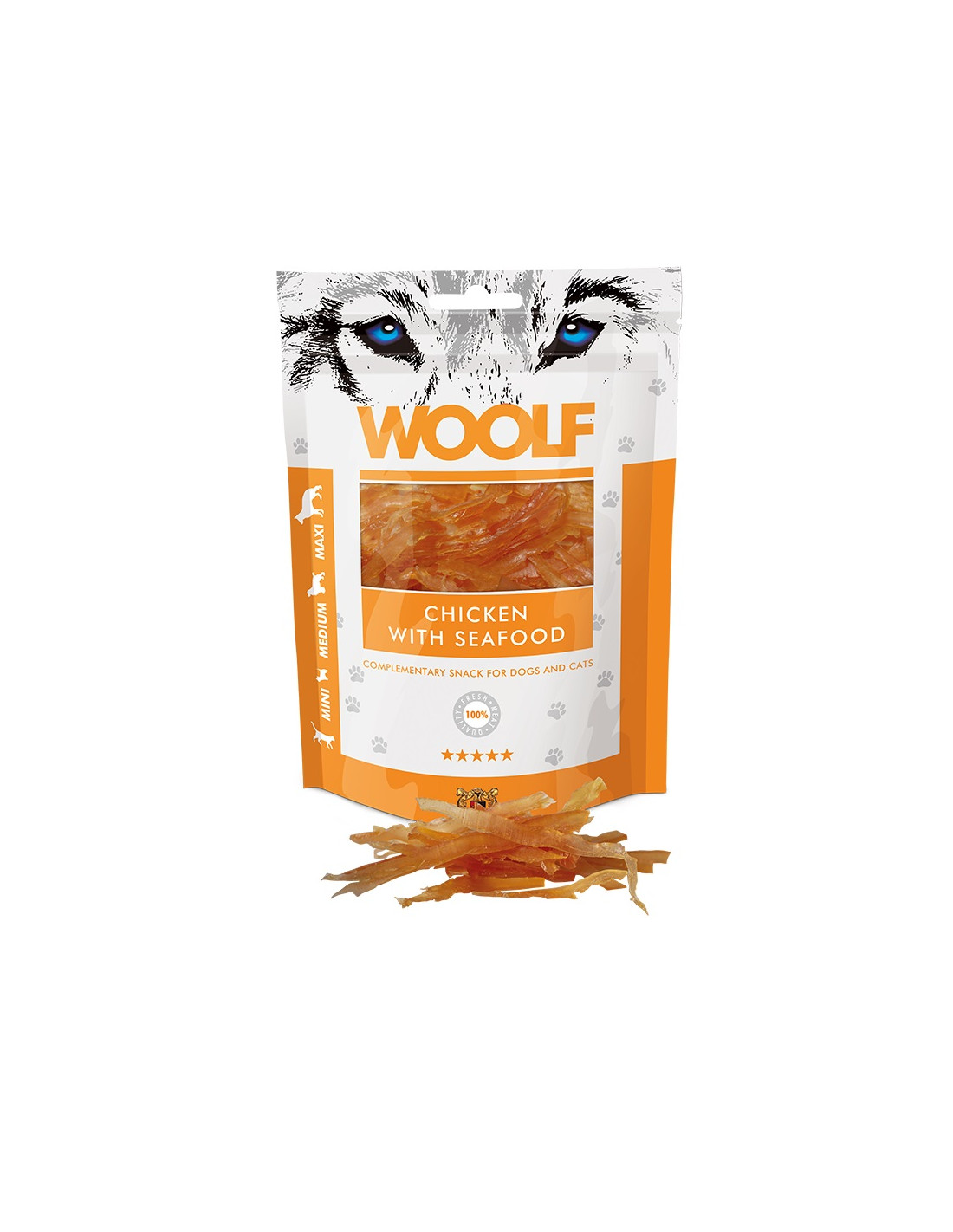 INGREDIENTES: Pollo (92%), extracto de marisco (1%), glicerina (4%). Todos los snacks Woolf se envasan sin aditivos químicos, conservantes ni colorantes