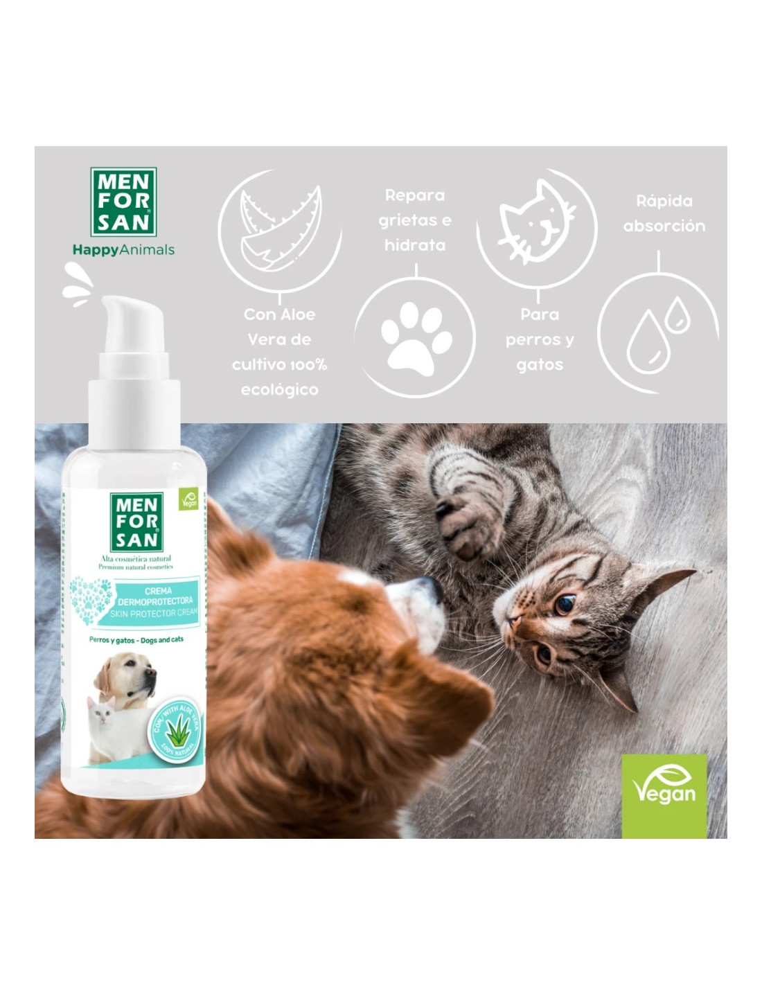 Este producto es ideal para animales con piel sensible, zonas despigmentadas, alergias leves o irritaciones superficiales. Gracias al efecto calmante y regenerador del aloe vera, la crema ayuda a aliviar el enrojecimiento, la sequedad y el malestar que pueden provocar los roces, los baños frecuentes o la exposición al sol. Además, su textura ligera y de rápida absorción permite aplicar la crema sin ensuciar el pelaje ni dejar sensación grasa.