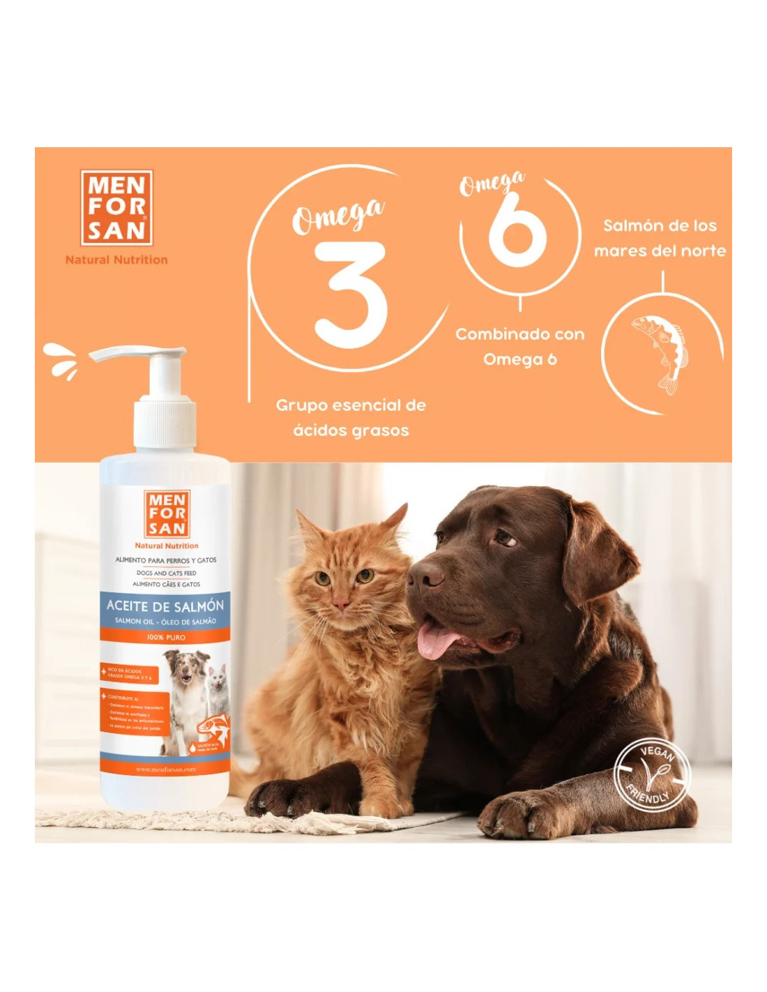 El Aceite de Salmón Menforsan es un complemento alimenticio de alta calidad, 100% puro, diseñado para aportar los nutrientes que tu perro o gato necesita para sentirse y lucir mejor cada día.