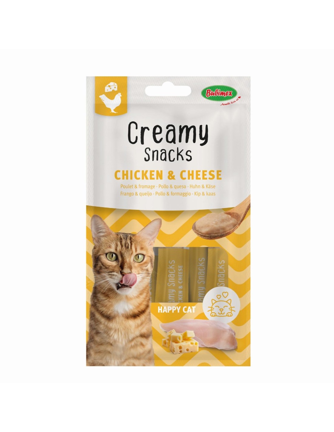 Los Creamy Snacks de pollo con queso de BUBIMEX para gatos son unos snacks cremosos ideales para mimar y premiar a tu gato. Con una textura ligera y cremosa que además es hidratante para tu felino, son un complemento alimenticio muy sabroso y saludable para lamer, que además de tener el irresistible sabor a pollo y queso. Puedes darle Creamy Snacks directamente del tubo o utilizarlo como topping mezclado con el pienso.