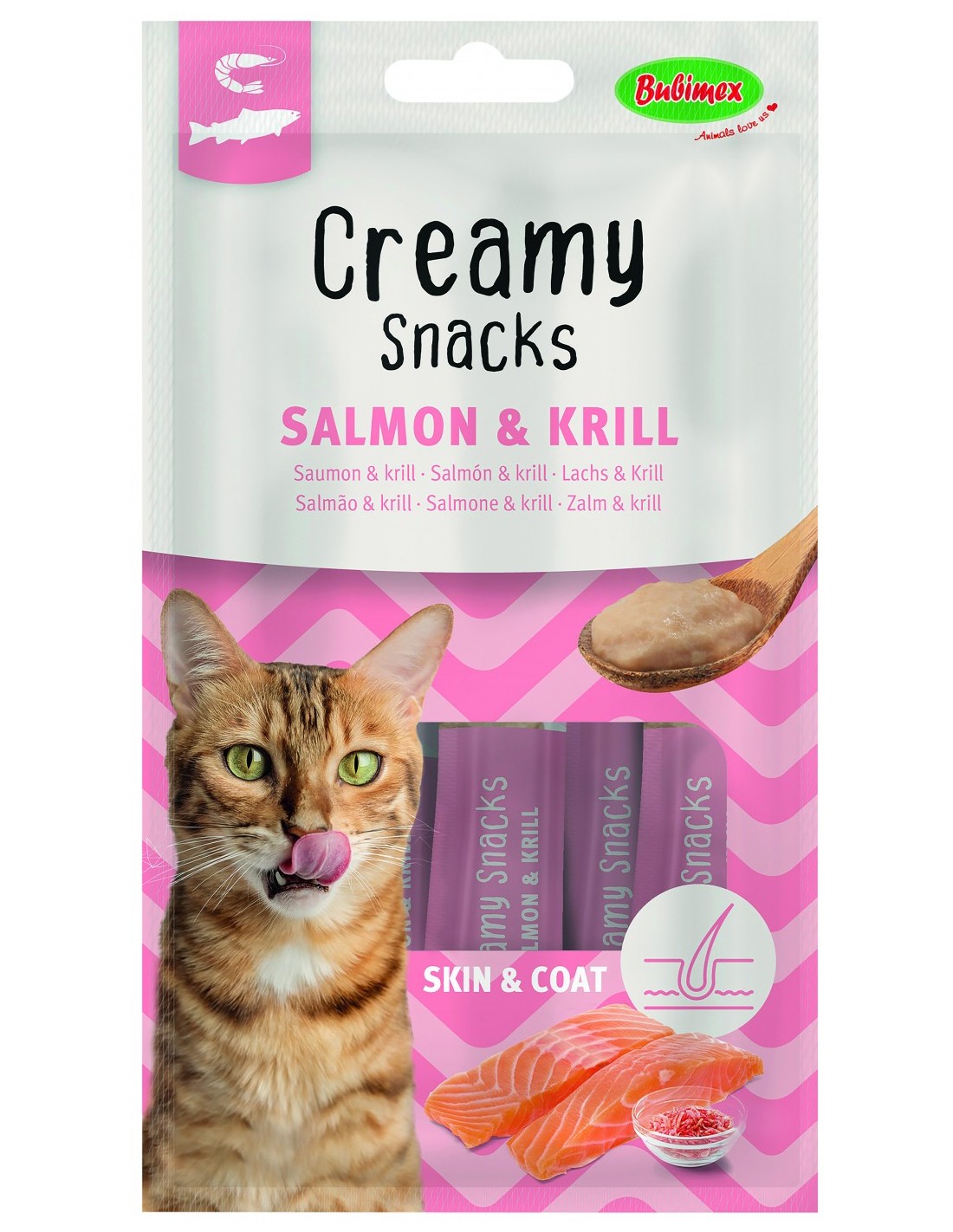 Los Creamy Snacks Skin & Coat de BUBIMEX de salmón y krill para gatos son unos snacks cremosos ideales para mimar y premiar a tu gato. Con una textura ligera y cremosa que además es hidratante para tu felino, son un complemento alimenticio muy sabroso y saludable para lamer, que además de tener el irresistible sabor a salmón, es un alimento que contiene krill, alimento que contribuye a la belleza del pelaje y a la salud de la piel de tu mascota.. Puedes darle a tu gato los Creamy Snacks directamente del tubo o utilizarlo como topping mezclado con el pienso.