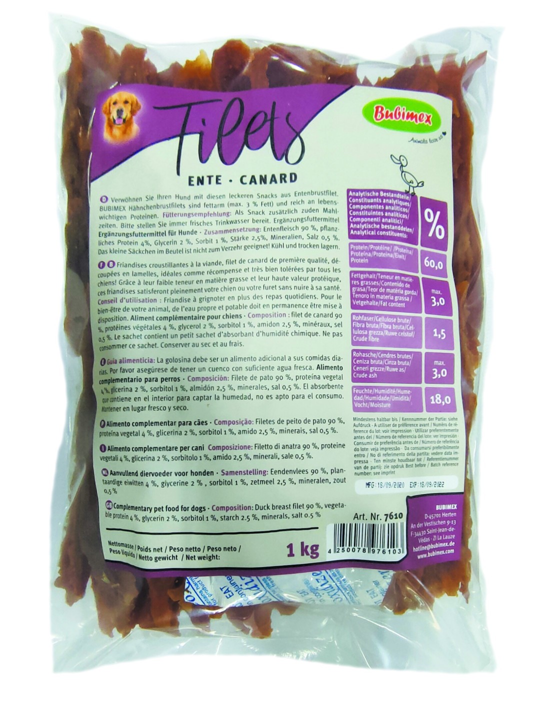 Filete de pato 90%, proteínas vegetales 4%, glicerol 2%, sorbitol 1%, almidón 2,5%, minerales, sal 0,5%. Proteína 60%, contenido de grasa 3%, fibra cruda 1,5%, ceniza cruda 3%, humedad 18%