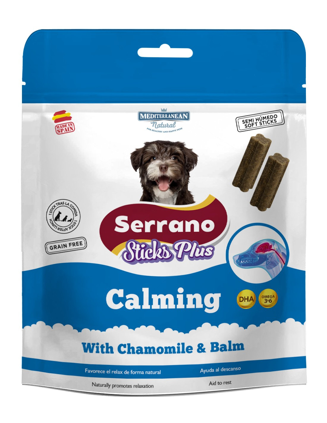 Mediterranean Serrano Sticks Antiestrés es un snack funcional diseñado para ayudar a reducir el estrés y favorecer el bienestar emocional de tu perro mientras disfruta de un delicioso premio. Elaborados con ingredientes de alta calidad, estos sticks están formulados con componentes que contribuyen a promover la calma y la relajación en situaciones de ansiedad, como viajes, visitas al veterinario o cambios de entorno.