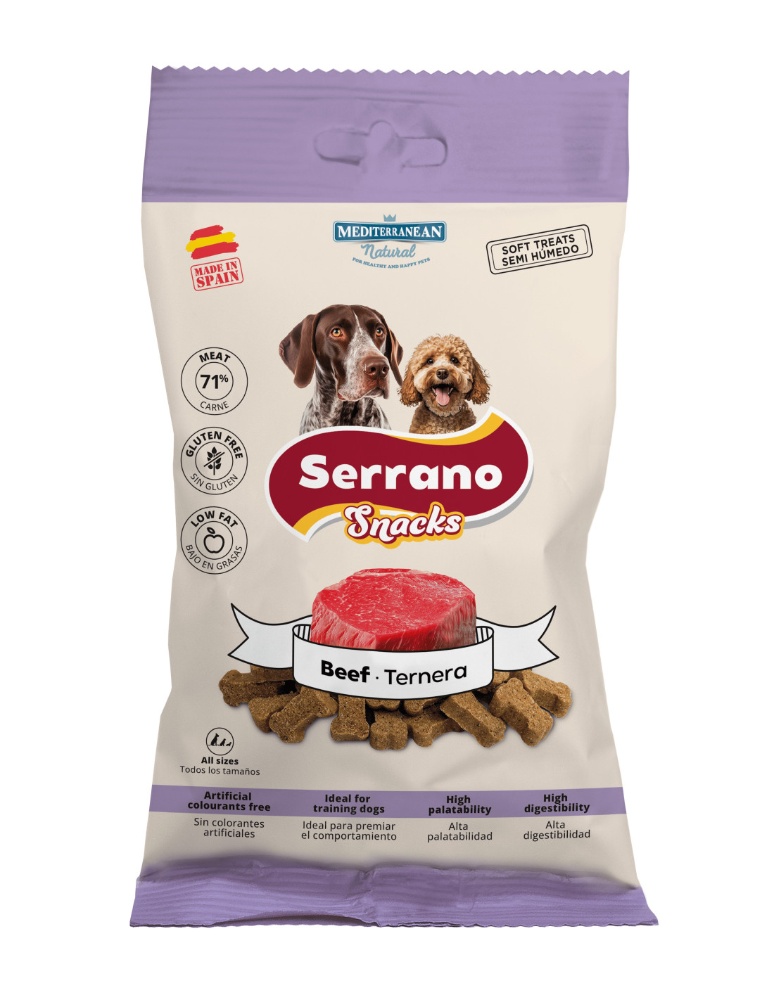 El snack de Serrano para perro de ternera de Mediterranean Natural es un premio natural y sabroso elaborado para cuidar y consentir a tu mascota cada día. Preparado con carne de ternera de alta calidad, este snack aporta proteínas esenciales que contribuyen al mantenimiento de una musculatura fuerte y a una energía equilibrada.