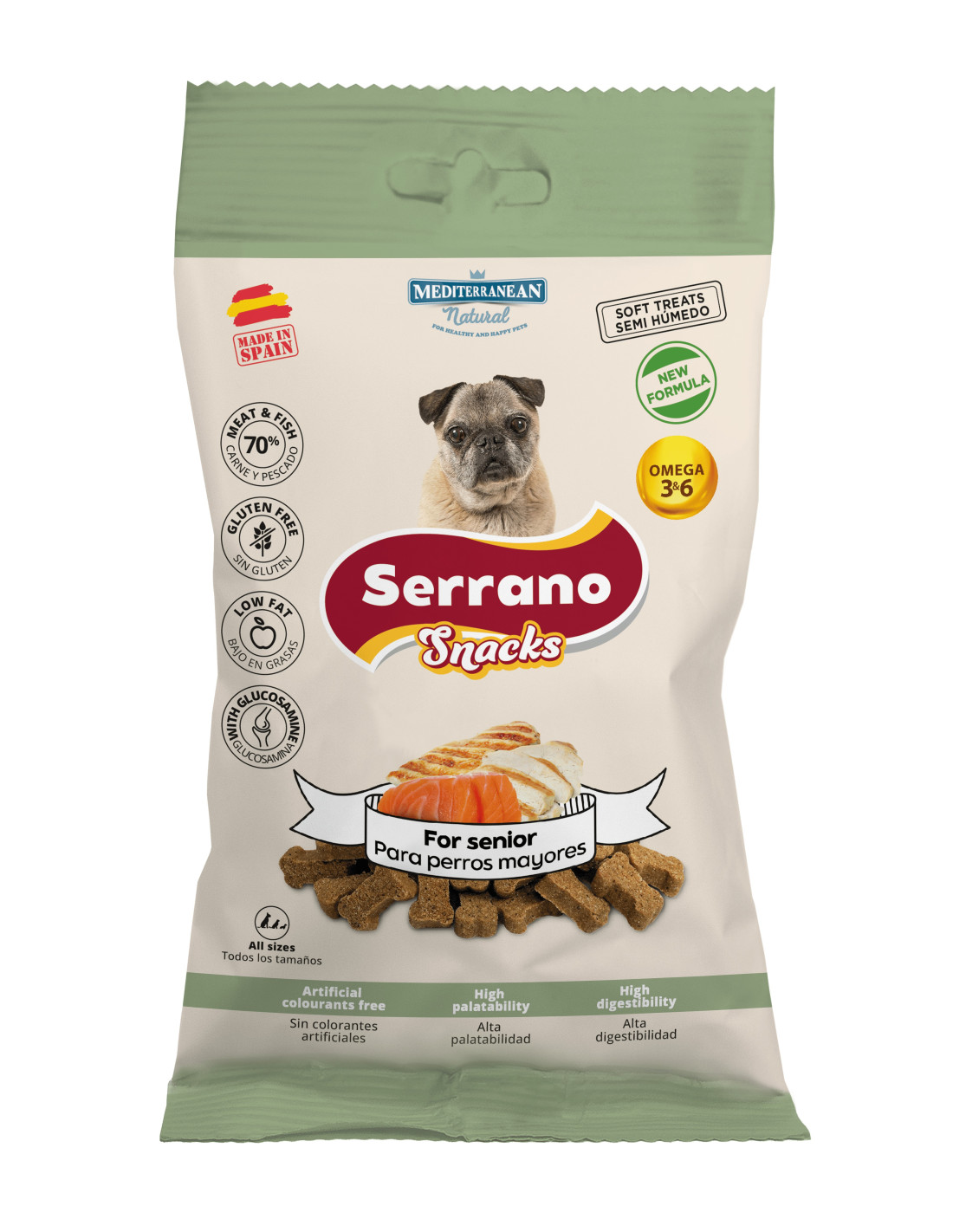 El snack de Serrano para perro senior de Mediterranean Natural es un premio semi-húmedo especialmente formulado para perros mayores, adaptándose a sus necesidades nutricionales y a su ritmo de vida. Elaborado con un alto porcentaje de carne, aporta proteínas de calidad que ayudan a mantener la masa muscular en la etapa senior.